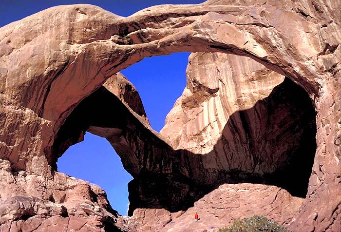 Under the Spell of Double Arch © Laurent Martres 1999 A human figure appears dwarfed by the awsome presence of Double Arch.
