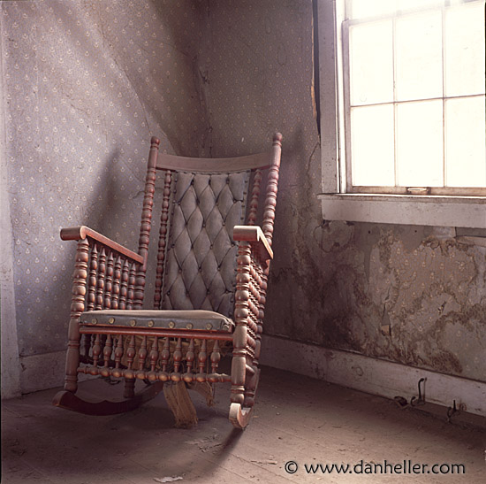 The light effect on the wall focus attention on the solitude of this lone rocking chair, almost in pristine condition.